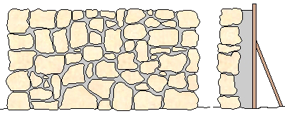 Replanteig del mur. Col·locació i aplomat de mires de referència. Estesa de fils entre mires. Neteja i humectació del llit de la primera filada. Col·locació de les maçoneries i encunyat dels mateixos amb reble. Tempteig amb regla i plomada, rectificant la seva posició mitjançant copejament. Col·locació de perpanys de tras en tras i enrasament del mur. Neteja del parament.